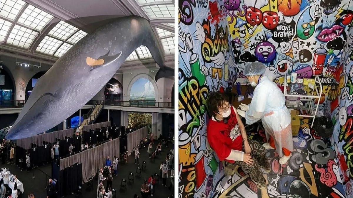 در شهر نیویورک، افراد ۱۸ سال و به بالا میتوانند واکسن کرونای خود را زیر مجسمهی ۲۸ متری یک نهنگ آبی که از سقف موزه تاریخ طبیعی این شهر آویزان شده، دریافت کنند.
