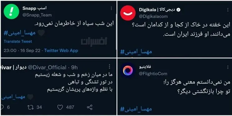 به گزارش مُنیبان؛ فارس نوشت: شرکتهای اینترنتی اسنپ، تپسی، دیجی کالا، دیجی پی، فیلیمو، آچاره، آپارات، زرین پال، کافه بازار، تخفیفان، ریحون و جاباما هشتگ مهسا امینی را تحت جو رسانهای منتشر کردند. اسنپ و تپسی پس از مدتی آن را حذف کردند. شرکتهای نظیر ریحون و زرین پال پا را فراتر از گلیم خود دراز کردند و در مسئلهای که جوانب آن مبهم است، حکم صادر کردهاند.