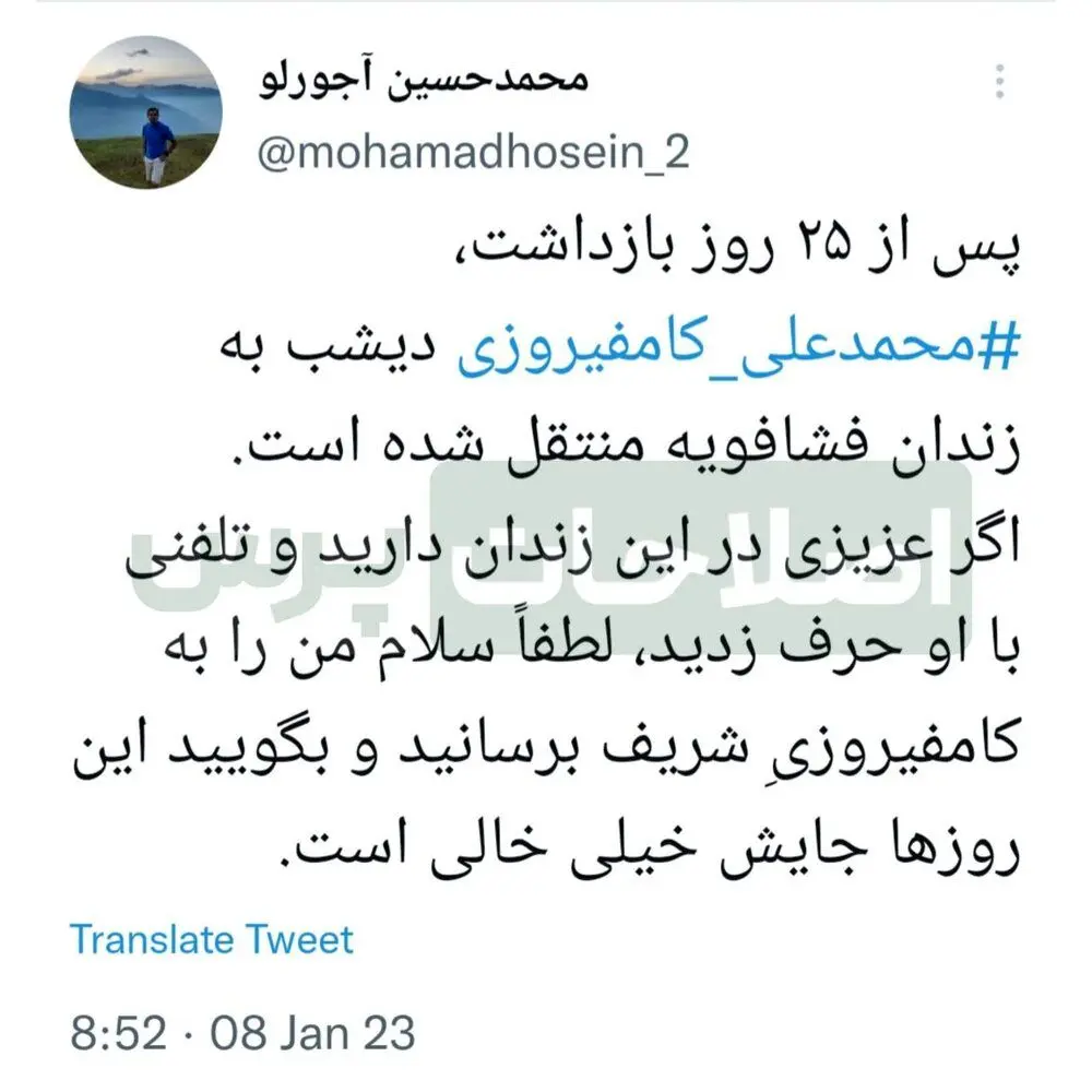 اعتمادآنلاین به نقل از همسر نیلوفر حامدی (خبرنگار بازداشتی روزنامه شرق) از انتقال محمدعلی کامفیروزی به زندان فشافویه خبر داد.