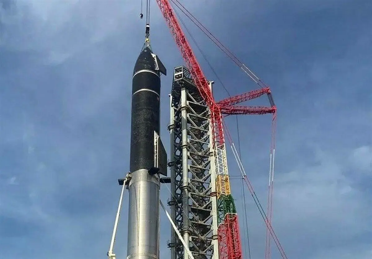 موشک قدرتمند "Super Heavy" به همراه فضاپیمای استارشیب که قویترین موشک جهان بوده و توسط شرکت اسپیسایکس ساخته شده است بر روی سکوی پرتاب قرار گرفته و آماده پرتاب است.
