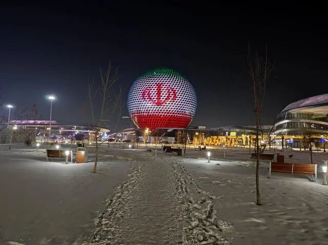 این سازه بزرگ کروی و شیشهای تقریبا از بخش عمده شهر آستانه قابل مشاهده است و در آن، چهلوچهارمین سالگرد پیروزی انقلاب شکوهمند اسلامی و روز ملی کشورمان به ایرانیان تبریک گفته شد.