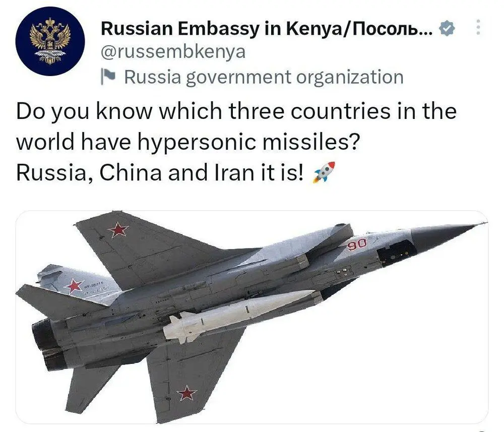 سفارت روسیه در اقدامی عجیب و نامتعاف، ایران را به عنوان یکی از «سه کشور جهان دارای موشکهای مافوق صوت» معرفی کرد.