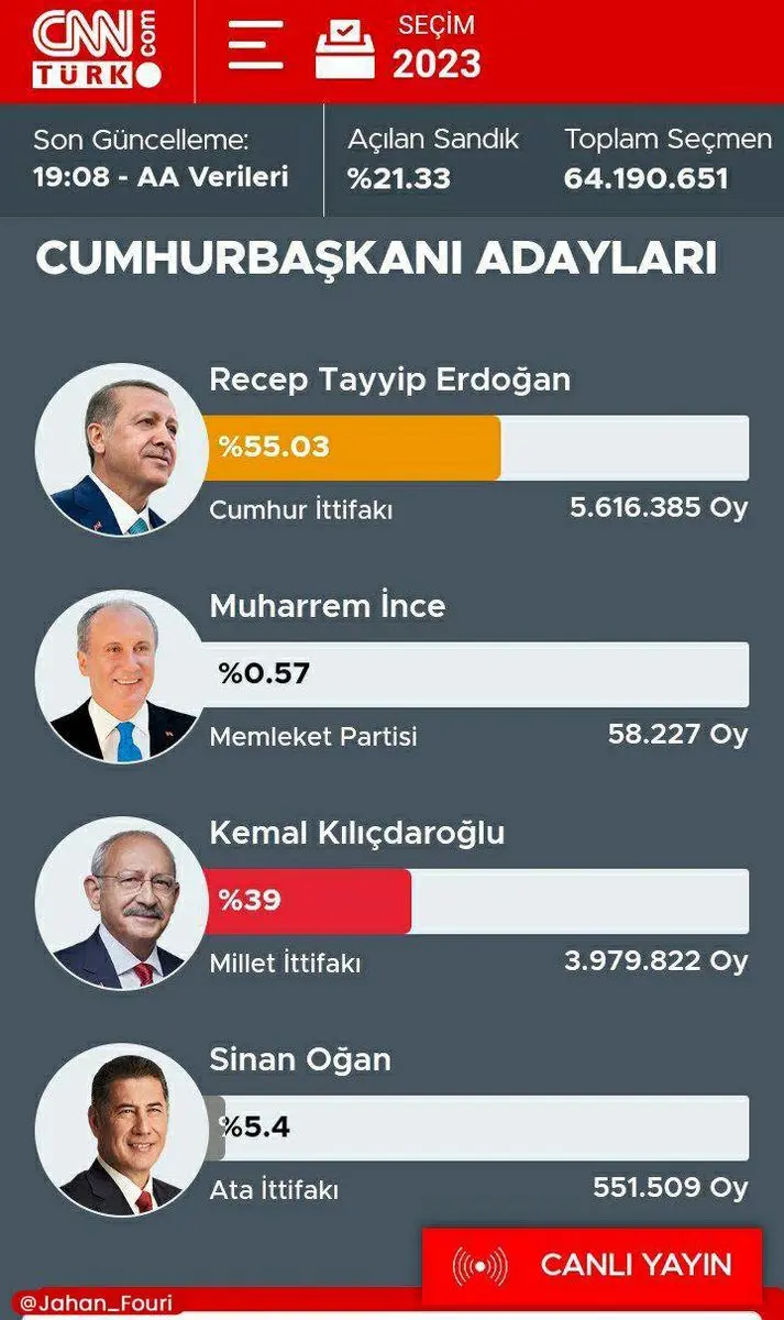 منصور یاواش، شهردار آنکارا گفت: «طبق نتایج ما از شمارش ۲۳.۸۷ درصد آرا، کمال قلیچدار اوغلو جلوتر است.»