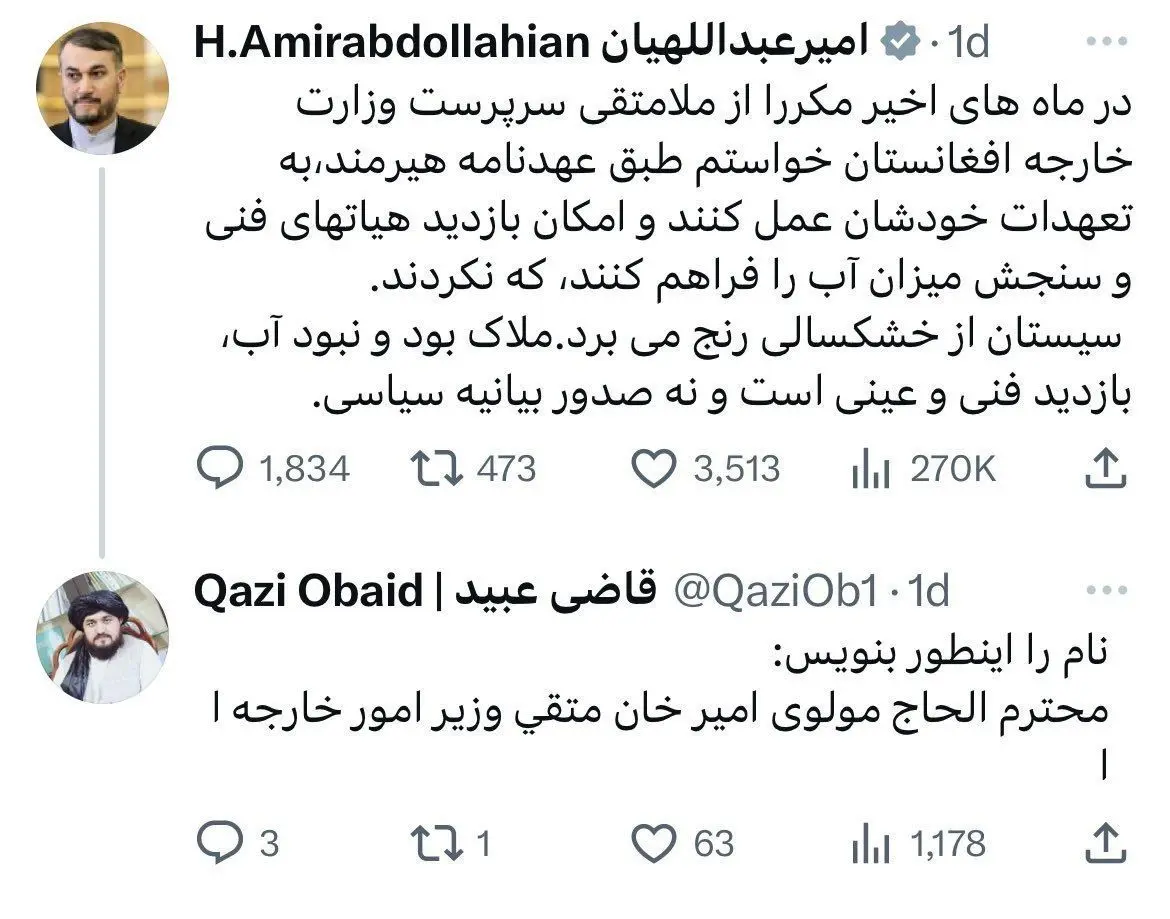 به گزارش منیبان، حسین امیرعبداللهیان، وزیر خارجه ایران نوشت: در ماههای اخیر مکررا از ملامتقی سرپرست وزارت خارجه افغانستان خواستم طبق عهدنامه هیرمند به تعهدات خودشان عمل کنند و امکان بازدید هیاتهای فنی و سنجش میزان آب را فراهم کنند که نکردند. سیستان از خشکسالی رنج میبرد ملاک بود و نبود آب، بازدید فنی و عینی است و نه صدور بیانیه سیاسی.