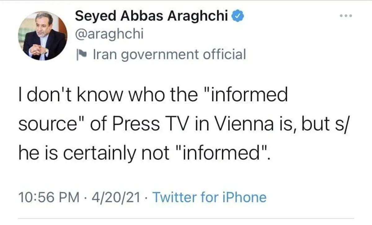 به گزارش منیبان؛ عباس عراقچی معاون وزیر خارجه و رئیس تیم مذاکره کننده ایران در وین در پیامی توییتری نوشت: «نمی‌دانم «منبع مطلع» پرس تی‌وی در وین کیست، اما هر که هست اصلا مطلع نیست.»