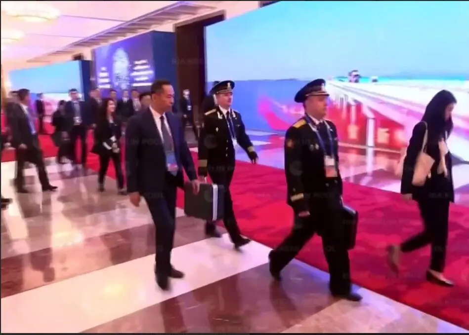 به گزارش منیبان، ویدئویی که از او پس از دیدارش با شی جینپینگ، رئیس جمهور چین منتشر شده است، نشان می‌دهد که او در حال رفتن به ملاقاتی دیگر در حالی است که نیروهای امنیتی اطراف او را احاطه کرده‌اند و دو افسر نیروی دریایی روسیه نیز در کنارش حضور دارند که هر کدام یک کیف به دست گرفته‌اند.