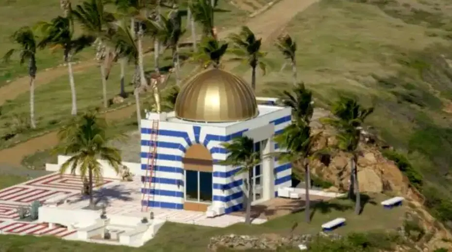 این معبد در مرتفعترین نقطه جزیره قرار دارد و یک ساختمان سفید عجیب و غریب با خطهای آبی بود که شبیه معبد بوده و به گفته یوتیوبر معمولا این نوع معبد خالدار برای آیینهای شیطانی از آن استفاده میشده است..