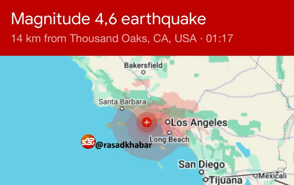 به گزارش منیبان، زلزلهای به بزرگی ۴.۶ در ساعت ۱۳:۴۷ روز جمعه ساحل جنوبی کالیفرنیا را لرزاند.