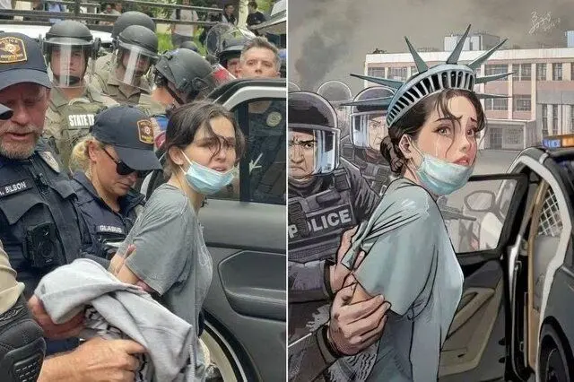 «به بند کشیده شدن ‎آزادی در ‎آمریکا - رسانه‌های آمریکایی: دستگیری حداقل ۹۰۰ نفر از معترضان توسط ‎پلیس آمریکا در جریان اعتراضات دانشجویی در این کشور در حمایت از ‎غزه».