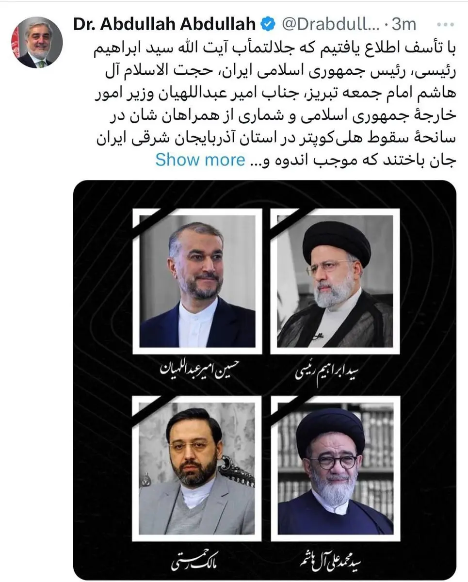 عبدالله عبدالله از شخصیتهای سیاسی افغانستان شهادت رییس جمهور ایران و وزیرامور خارجه را تسلیت گفت.