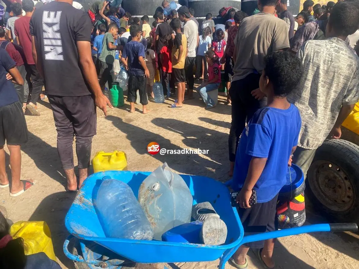 به دلیل کمبود سوخت و از کار افتادن تاسیسات حیاتی غزه، مردم ناگزیر از طی مسافتی طولانی در گرمای شدید و ایستادن در نوبت دریافت آب هستند.