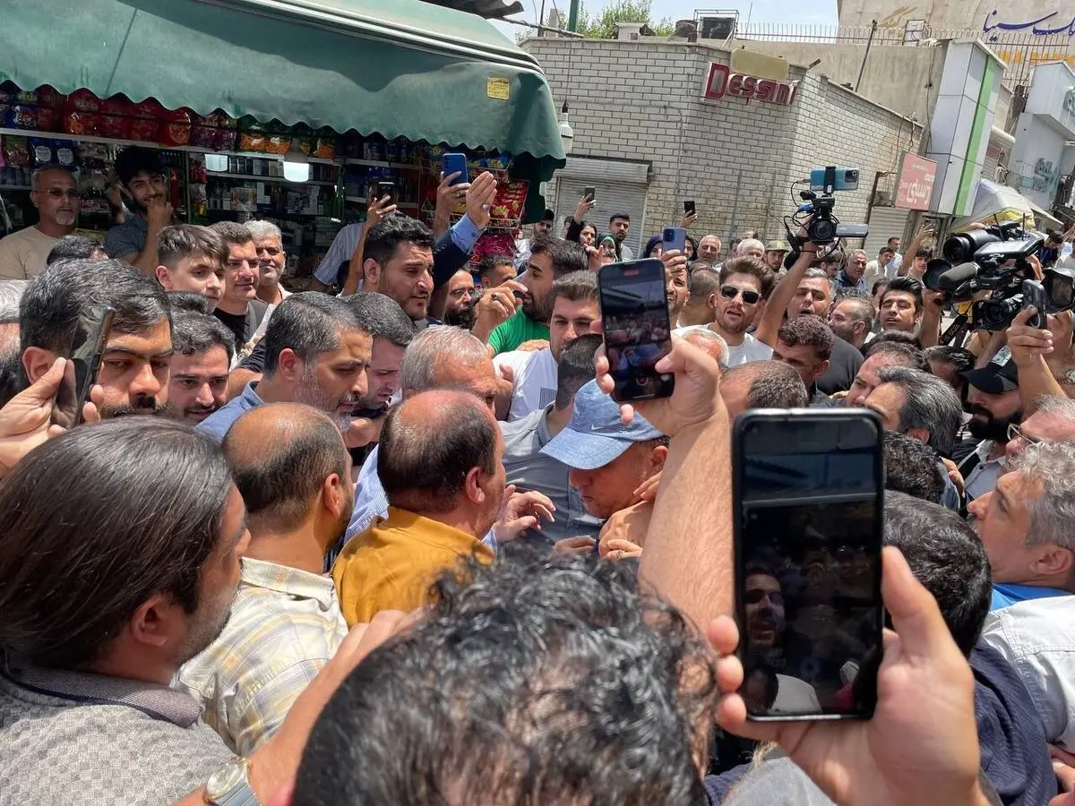 کسبه و مردم حاضر در بازار از ساعاتی پیش در این منطقه تجمع کرده اند و ضمن استقبال با شعار حمایت خود را از پزشکیان اعلام کردند.