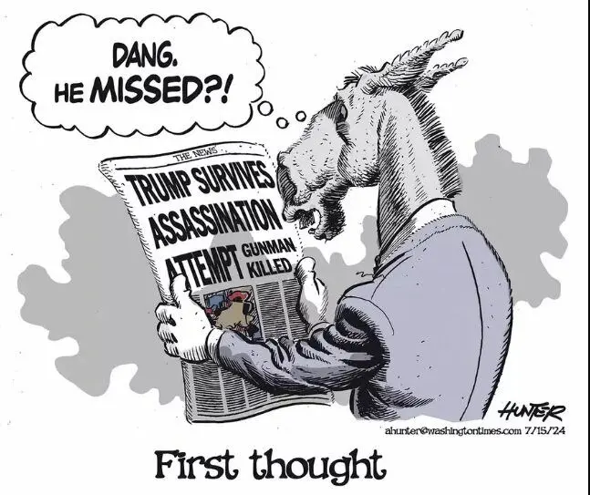 به گزارش منیبان، روزنامه واشنگتن تایمز نزدیک به محافظه کاران در ایالات متحده با انتشار کاریکاتوری به حادثه ترور نافرجام دونالد ترامپ واکنش نشان داده است. این کاریکاتور با عنوان «برداشت اول» منتشر شده و به خطا رفتن تیر ضارب اشاره می کند.
