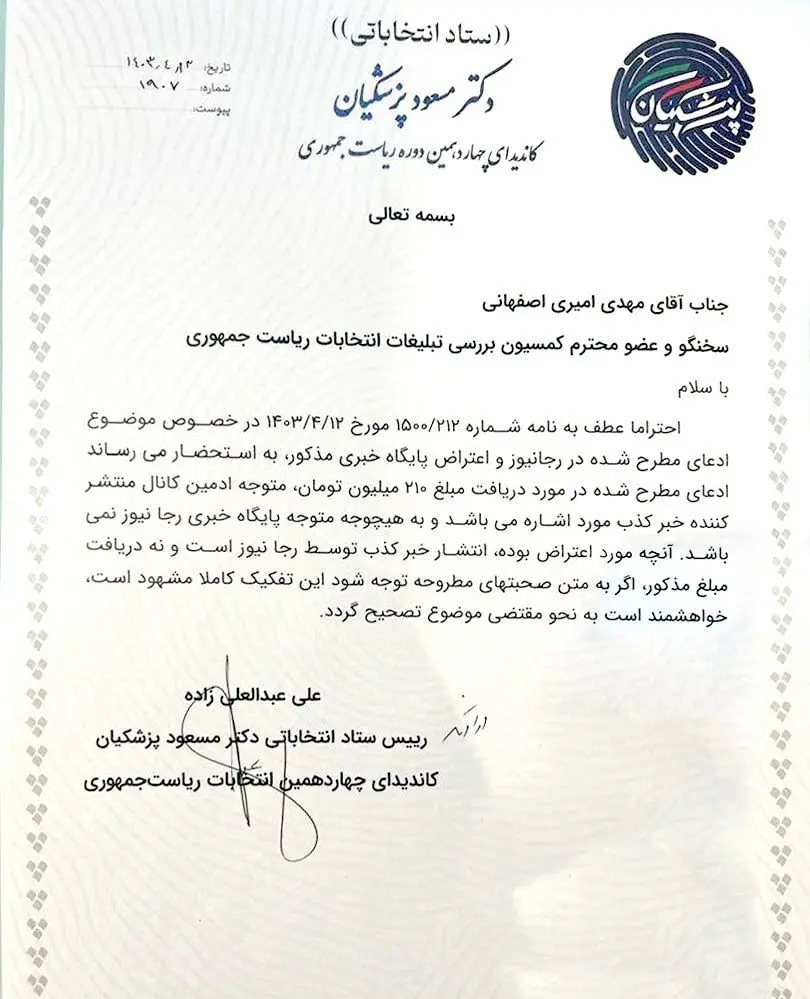 پیرو اعتراض رجانیوز، کمیسیون از ستاد پزشکیان خواست تا مستندات خود را ارائه کند اما رئیس ستاد او در نامهای مدعی شد که منظور پزشکیان از دریافت پول، ادمین کانال درج کننده توهین بوده (که تصویر آن در رجانیوز منتشر شده) نه رجانیوز بعنوان بازنشر کننده آن.
