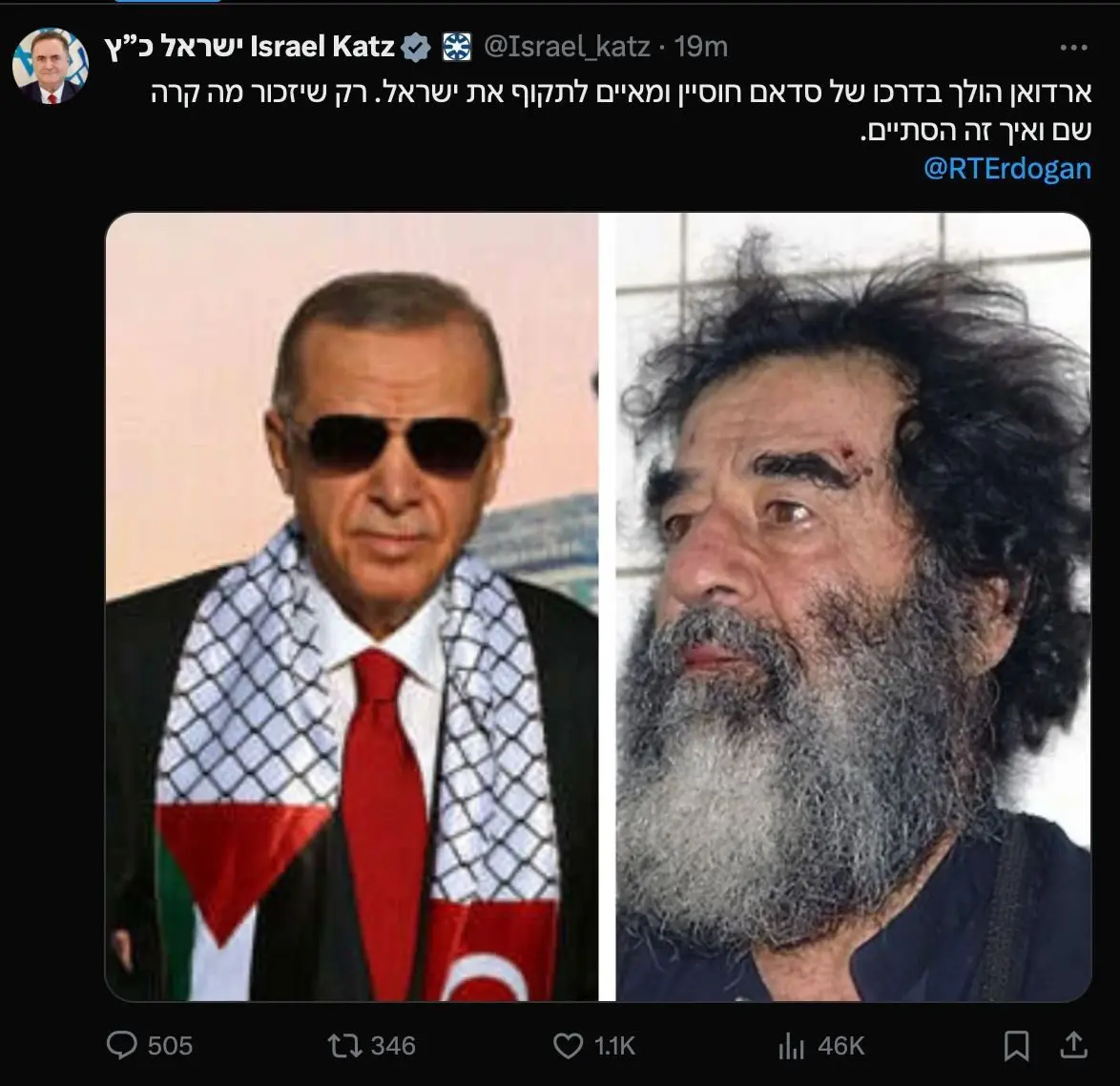 به گزارش منیبان، وزیر خارجه رژیم‌صهیونیستی در ایکس با انتشار عکس صدام و اردوغان نوشت: اردوغان راه صدام حسین را در پیش گرفته و تهدید به حمله به اسرائیل می کند. او فقط باید به خاطر بیاورد که آنجا چه اتفاقی افتاد و چگونه به پایان رسید.