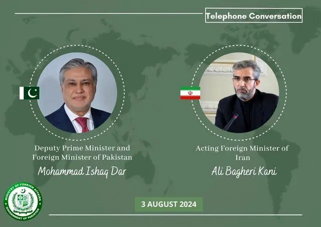 به گزارش منیبان، وزارت امور خارجه پاکستان در پیامی در صفحه خود در شبکه اجتماعی ایکس از گفتوگوی تلفنی «علی باقری کنی» سرپرست وزارت امور خارجه ایران و «اسحاق دار» معاون نخستوزیر و وزیر امور خارجه پاکستان خبر داد.