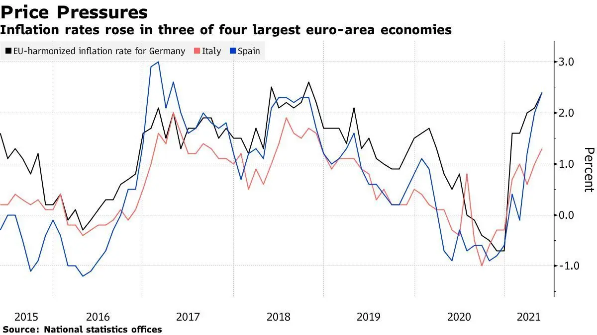 آلمان نیز مانند اسپانیا و ایتالیا با افزایش قیمت کالاها مواجه شده و نرخ تورم آن در ماه مه امسال به ۲.۴ درصد رسید. تخمین زده میشود که نرخ تورم حوزه یورو نیز به ۱.۹ درصد افزایش یابد. بوندس بانک آلمان پیشبینی کرده که نرخ تورم تا ۴ درصد افزایش یابد که این افزایش در بیست چند سال پس از تشکیل واحد پولی یورو سابقه نداشته است.