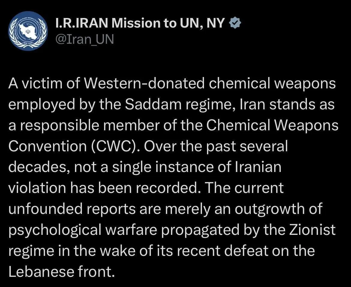 نمایندگی ایران در سازمان ملل نوشت: ایران به‌عنوان قربانی سلاح‌های شیمیایی اهدایی غرب به رژیم صدام، عضو مسئول معاهده منع سلاح‌های شیمیایی است.