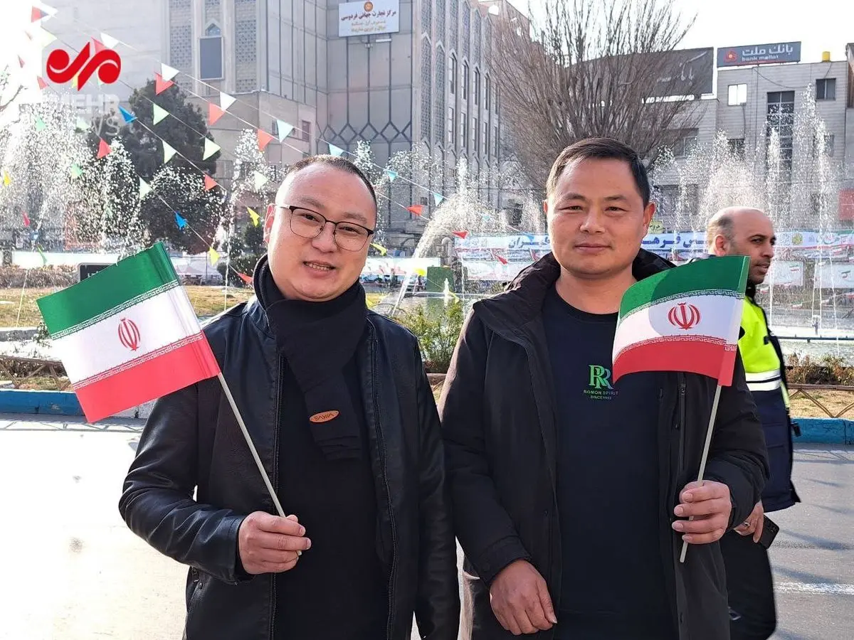 گردشگران چینی در مراسم راهپیمایی ۲۲ بهمن با پرچم کشورمان حضور یافتند تا حماسه مردم ایران را از نزدیک ببینند.