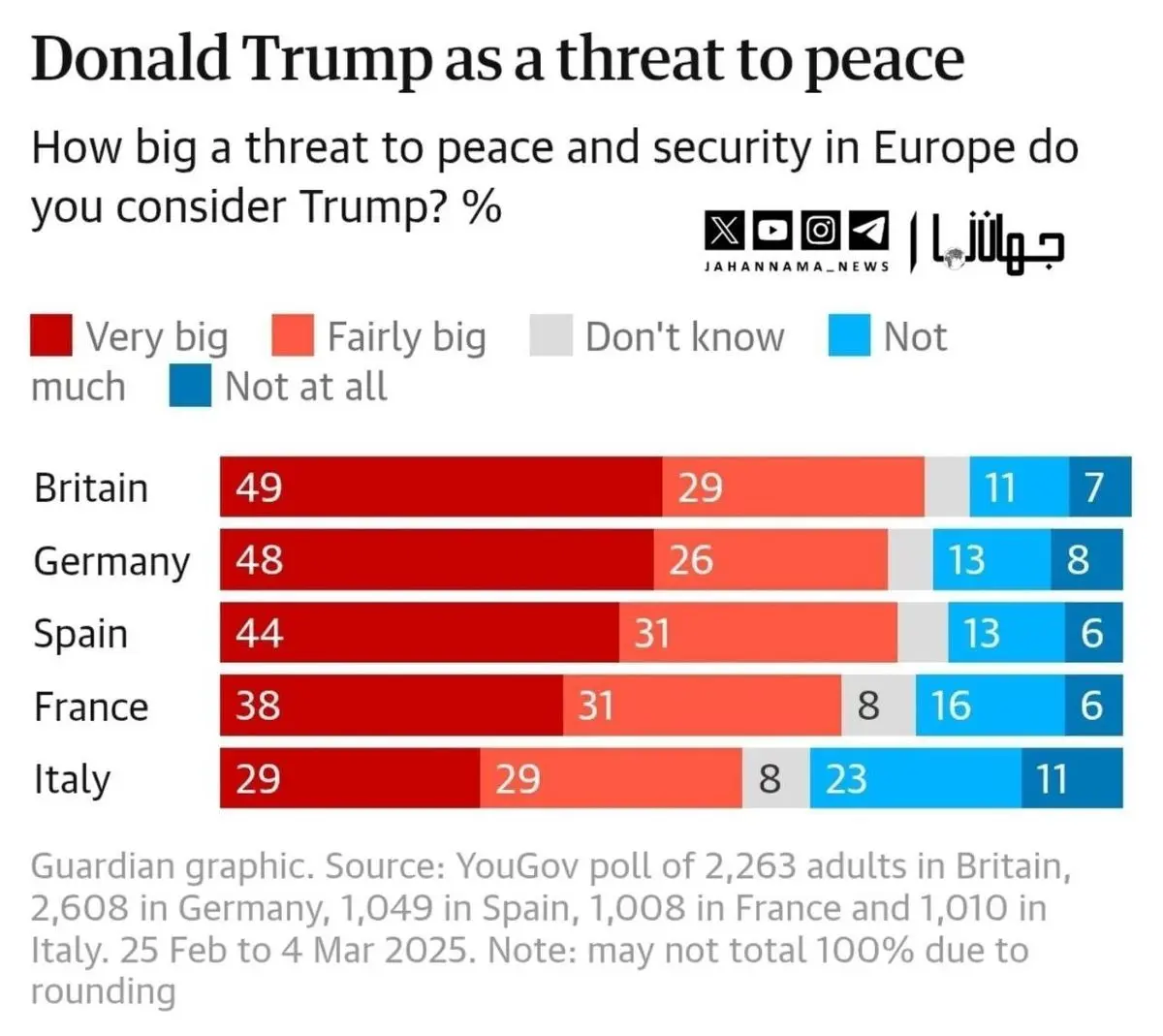 گاردین نوشت: نظرسنجیها نشان میدهد که اکثر اروپاییهای غربی فکر میکنند ترامپ تهدیدی برای صلح است.