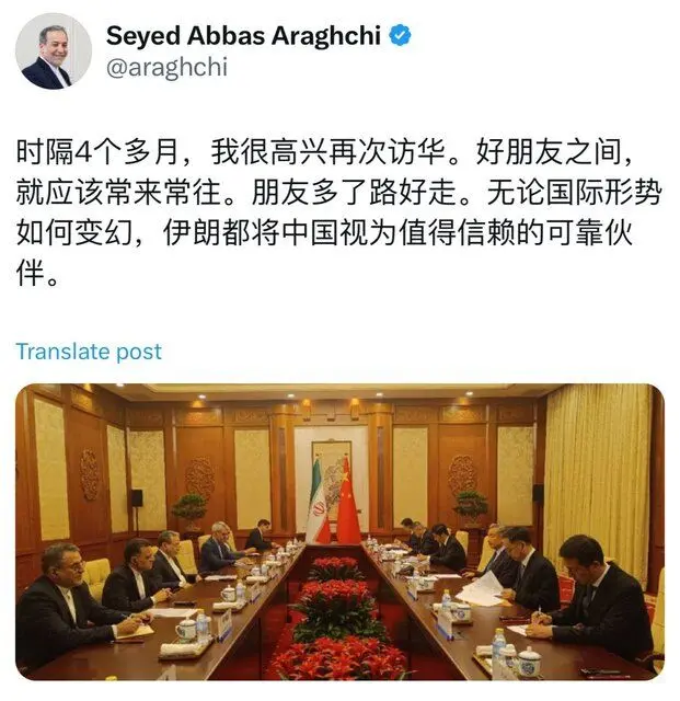 به گزارش منیبان، «سید عباس عراقچی»، وزیر امور خارجه جمهوری اسلامی ایران، روز چهارشنبه و پس از دیدار با «وانگ یی»، وزیر امور خارجه چین، در پکن در مطلبی در شبکه اجتماعی ایکس به زبان چینی نوشت: خوشحالم که در کمتر از چهار ماه برای دومین بار به چین سفر کردم.