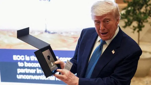 به گزارش منیبان، فیلمی که توسط «مارگو مارتین» دستیار ویژه و مشاور ارتباطات دونالد ترامپ، رئیس جمهور آمریکا به صورت آنلاین به اشتراک گذاشته شده، لحظه‌ای را نشان می‌دهد که در جریان سفر دیپلماتیک ترامپ به این امارات یک یادگاری به او اهدا شد.