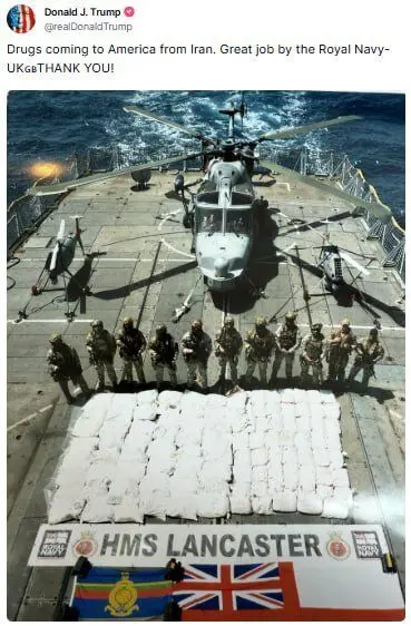 به گزارش منیبان، دونالد ترامپ، رئیسجمهور ایالات متحده، روز یکشنبه با انتشار پیامی در صفحه شخصی خود در شبکه اجتماعی تروثسوشال، ادعایی جنجالی علیه ایران مطرح کرد. وی در این پست مدعی شد که «مواد مخدر ارسالشده از سوی ایران به مقصد آمریکا» توسط نیروی دریایی سلطنتی بریتانیا توقیف شده است و از نیروهای بریتانیایی بابت این اقدام تشکر کرد.