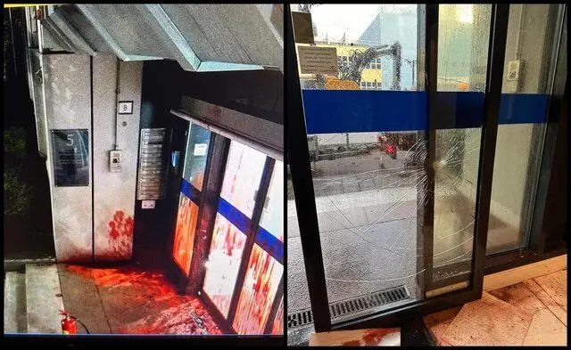 ریختن رنگ خون بر سفارت اسرائیل + عکس