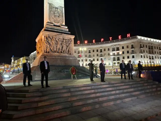 مسعود پزشکیان شامگاه سهشنبه ۲۸ مرداد، در ساعات نخست ورود به بلاروس باهدف انجام سفر رسمی به دعوت رئیسجمهوری این کشور، در میدان ویکتوری شهر مینسک که برای گرامیداشت یاد سربازان وطن ساخته شده، حضور یافت و به مقام قهرمانان درگذشته بلاروسی در جنگ میهنی ادای احترام کرد.