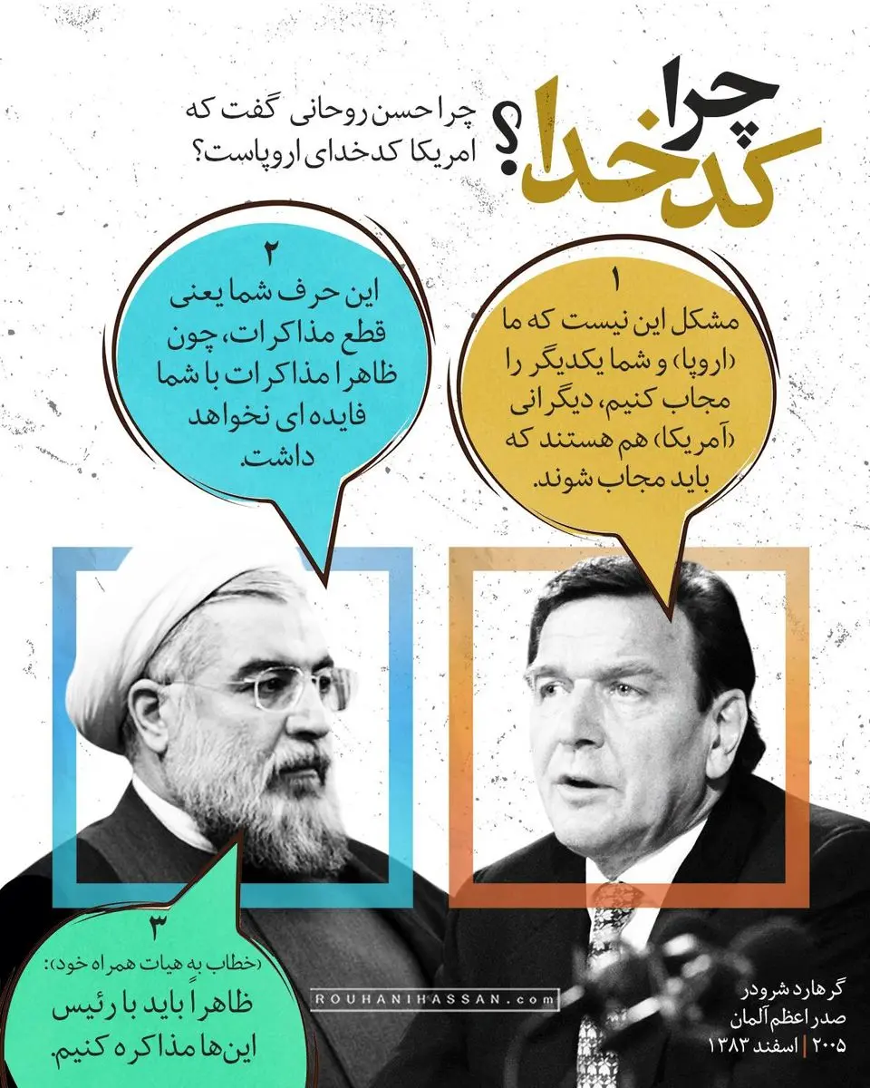اما این دریافت و توصیف روحانی از نسبت اروپا و ایالات متحده از کجا نشأت گرفته؟ در اسفند ۱۳۸۳، روحانی در مقام دبیر شورای عالی امنیت ملی به پاریس و برلین سفر می‌کند؛ در کاخ الیزه به دیدار ژاک شیراک می‌رود و در برلین، گرهارد شرودر، صدراعظم وقت آلمان را ملاقات می‌کند.