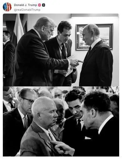رئیس جمهوری آمریکا، تصویری از گفتگوی خود با ولادیمیر پوتین در حاشیه نشست خبری آلاسکا منتشر کرد و آن را کنار صحنه تاریخی تقابل ریچارد نیکسون از روسای جمهور سابق آمریکا با نیکیتا خروشچف، رهبر پیشین شوروی گذاشت.
