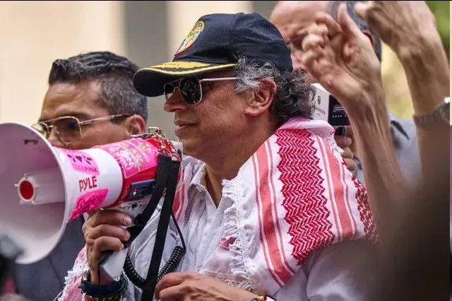 براساس این گزارش رییسجمهور کلمبیا در هنگام سخنرانی در مجمع عمومی سازمان ملل با دستبندی از پرچم فلسطین در این نشست حضور پیدا کرده بود.