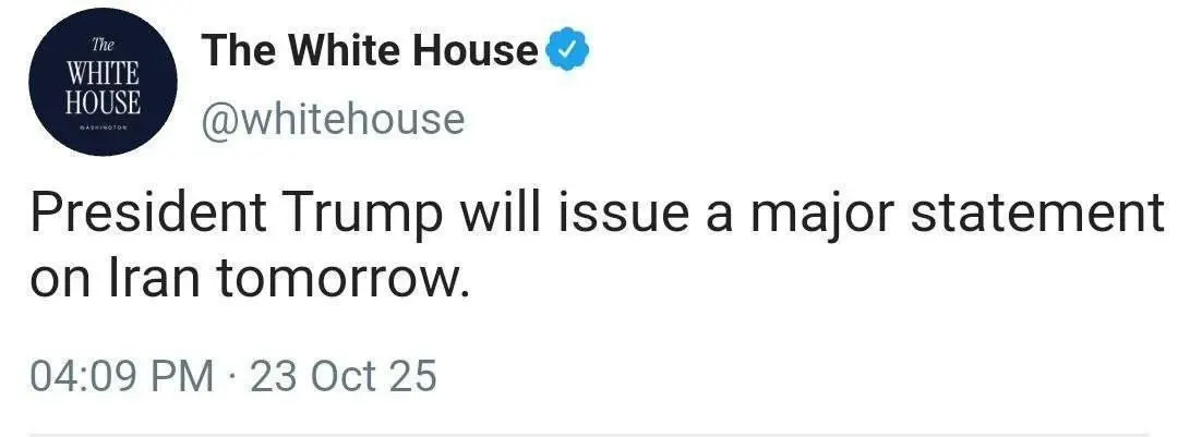برخی کانالهای تلگرامی با انتشار تصویر توییتی از اکانت کاخ سفید نوشتند: «کاخ سفید: ترامپ فردا بیانیه مهمی درباره ایران صادر خواهد کرد.»