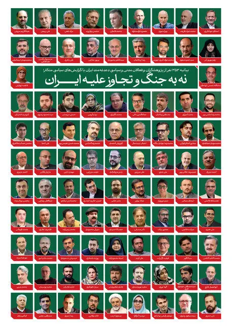۳۵۳ نفر از «پژوهشگران، فعالان مدنی و سیاسی و دغدغه‌مندان ایران» با طیف وسیعی از گرایش‌های متکثر بیانیه‌ای با عنوان «نه به جنگ و تجاوز علیه ایران» امضا و منتشر کرده‌اند و از عموم شهروندان دعوت کرده‌اند صدایشان علیه جنگ و تجاوز به ایران را بلند کنند.