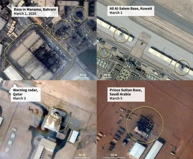 علاوه بر پایانههای SATCOM ازدسترفته در بحرین، تحلیل تصاویر ماهوارهای توسط نیویورک تایمز از پایگاه عریفجان در کویت، تخریب سه گنبد راداری دیگر را نشان میدهد که تقریبا ۳۰ میلیون دلار به هزینهها اضافه میکند.