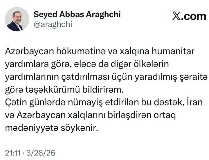 سیدعباس عراقچی در مطلبی در شبکه اجتماعی نوشت: از دولت و مردم جمهوری آذربایجان، بابت ارسال کمک های انسان دوستانه و همچنین فراهم کردن انتقال کمک های انسان دوستانه دیگر کشورها صمیمانه تشکر می‌کنم.