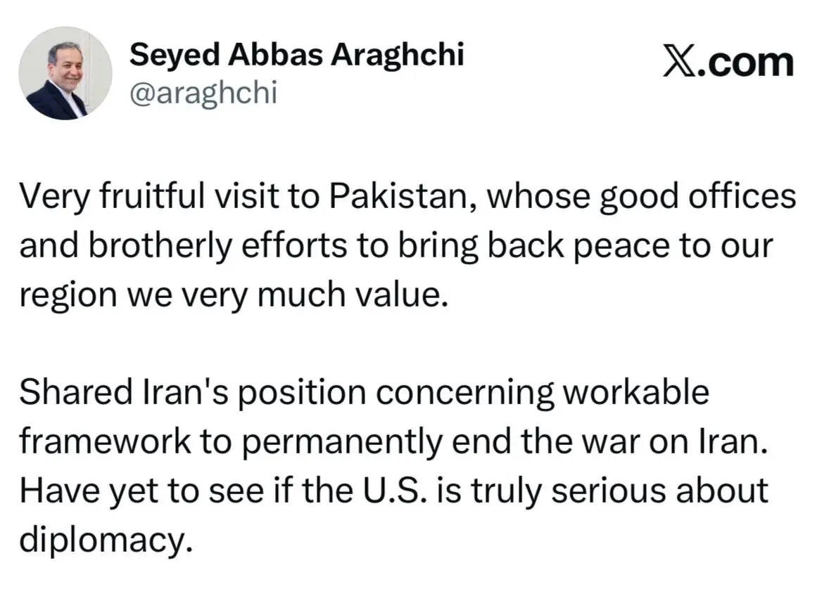 در این سفر، موضع جمهوری اسلامی ایران را درباره یک چارچوب عملی و قابل اجرا برای پایان دائمی جنگ علیه ایران تشریح کردم. باید دید آیا ایالات متحده واقعاً از ارادهای جدی برای پیشبرد دیپلماسی برخوردار است.