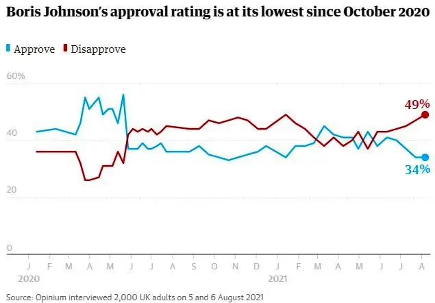 به گزارش منیبان؛ به نقل از شماره دیروز (۱۶ مرداد) روزنامه گاردین ، در حال حاضر ۳۴ درصد شرکت‌کنندگان در نظرسنجی موسسه اپینیوم  که در روزنامه آبزرور منتشر شده از عملکرد جانسون رضایت داشته و ۴۹ درصد ناراضی‌اند که این نارضایتی نسبت به نظرسنجی پیش ۲ درصد بیشتر شده است.