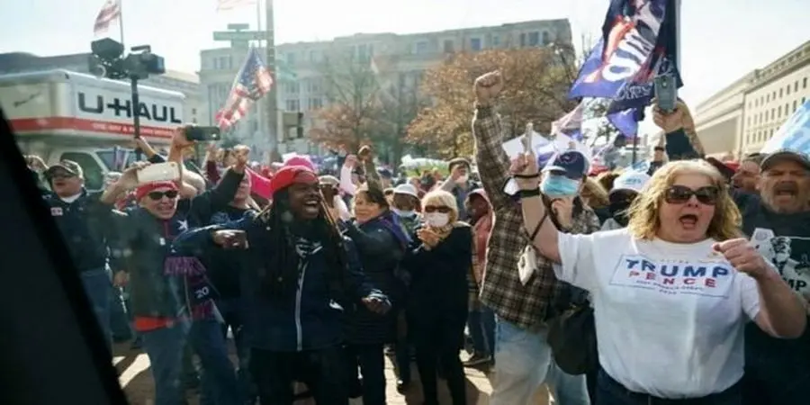 برخی از معترضان پارچه نوشته‌هایی در حمایت از «دونالد ترامپ» رئیس جمهور پیشین آمریکا حمل می‌کنند. ترامپ در انتخابات ریاست جمهوری سال ۲۰۲۰ به بایدن باخت.