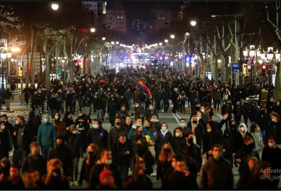 تظاهرکنندگان خشمگین اسپانیایی برای پنجمین شب پیاپی، در اعتراض به بازداشت یک خواننده به اتهام تبلیغ تروریسم و توهین به خاندان سلطنتی اسپانیا، کانتینرها را به آتش کشیده و شیشه های فروشگاه ها را در بارسلون مرکز استان کاتالونیا شکستند.