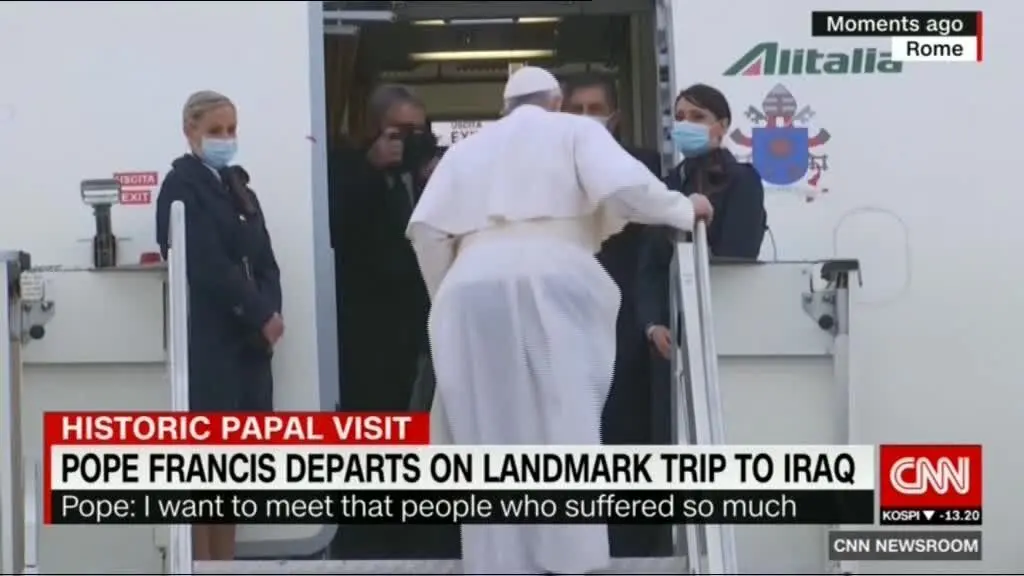 پاپ فرانسیس رهبر کاتولیک های جهان صبح امروز جمعه از مبدا رم پایتخت ایتالیا راهی عراق شد و انتظار می رود تا ساعاتی دیگر وارد بغداد شود.