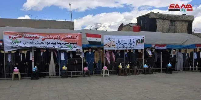 شرکت کنندگان در این تجمع که با حضور بزرگان شیوخ عشایر قبیله «طی» برگزار شد بر حمایت از مقاومت مردمی برای بیرون راندن نظامیان خارجی که به صورت غیرقانونی در سوریه حضور دارند و به غارت محصولات کشاورزی و منابع طبیعی مبادرت میورزند، تأکید کردند.