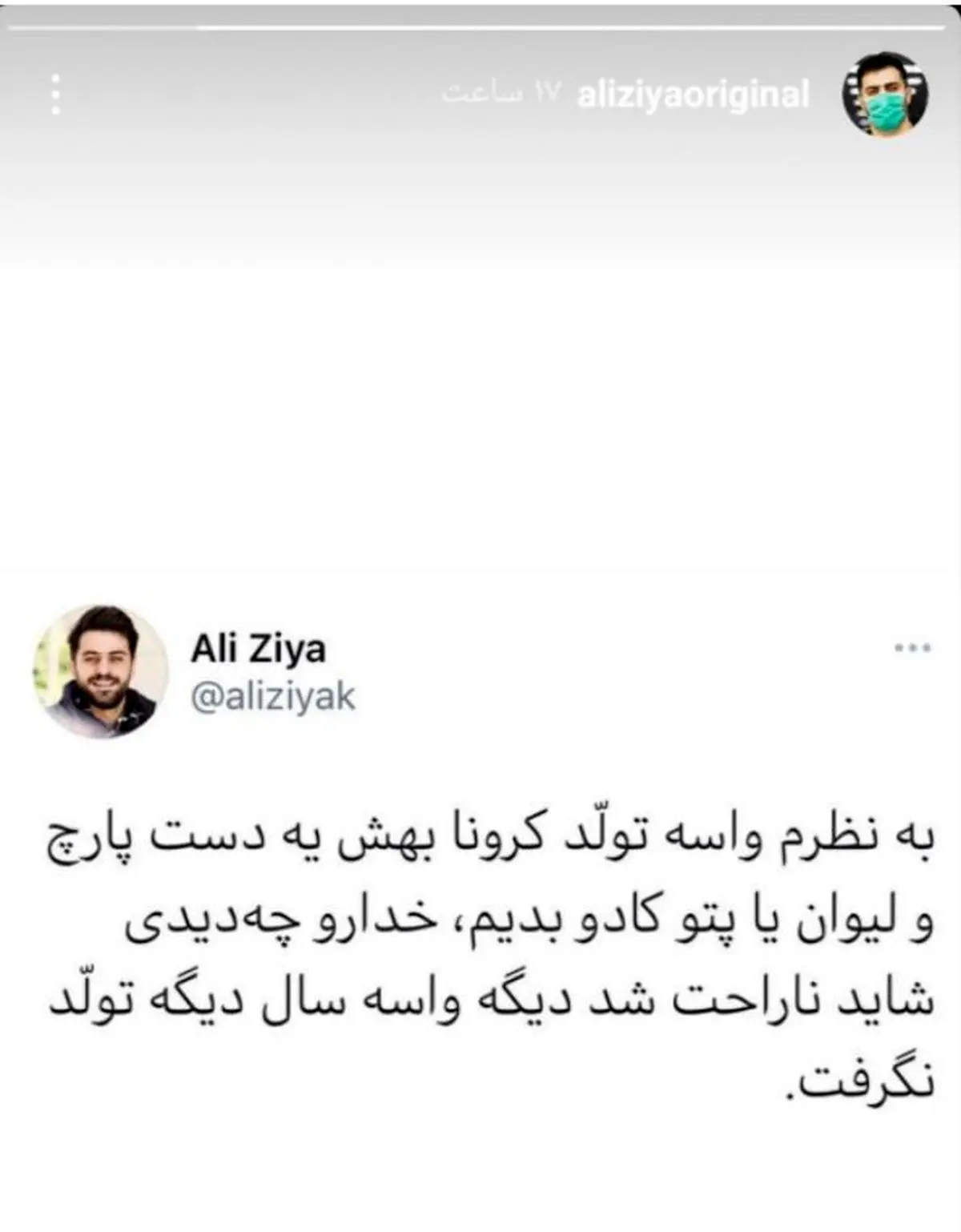 علی ضیا ، مجری معروف و پرطرفدار برنامه های تلویزیونی به بهانه یک ساله شدن شیوع کرونا در جهان، متن زیر را در صفحهاش به اشتراک گذاشت.