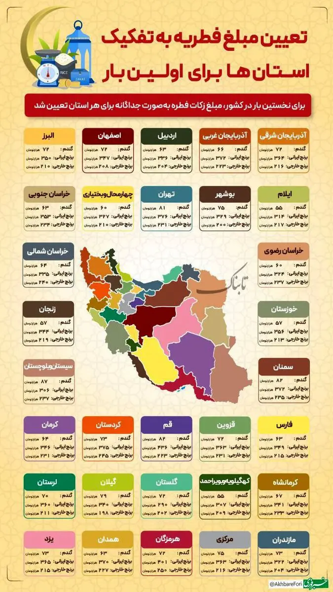 برای اولین بار مبلغ فطریه به تفکیک استانها اعلام شد