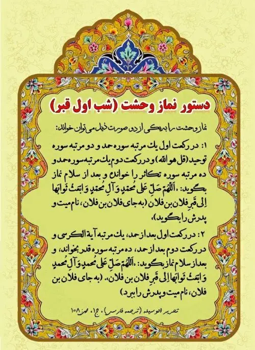به گزارش منیبان، امروز پنجشنبه پیکر شهدای خدمت در شهرهای مشهد، بیرجند، اصفهان، زنجان و تبریز تشییع شد. با توجه به اینکه تدفین بیشتر شهدای سانحه سقوط بالگرد امروز انجام شده و تا ساعتی دیگر نیز پیکر آیتالله شهید رئیسی نیز در حرم مطهر امام رضا علیهالسلام تدفین میشود، تعداد زیادی از هموطنان آماده قرائت نماز لیلةالدفن برای شهدا میشوند. با توجه به اینکه در عبارت آخر این نماز، نیاز به ذکر نام پدر فرد متوفی است، نام پدر شهدای اخیر ذکر میشود: نام پدر شهید سیدابراهیم رئیسی: سید حاجی نام پدر شهید حسین امیرعبدللهیان: محمد نام پدر شهید سید محمدعلی آل هاشم: سید محمد تقی نام پدر شهید مالک رحمتی: حاج اسکندر نام پدر شهید محسن دریانوش: مختار نام پدر شهید سیدطاهر مصطفوی: سید احمد نام پدر شهید سیدمهدی موسوی: سید محمدعلی نام پدر شهید بهروز قدیمی: اسحاق در ادامه نظر برخی از مراجع در مورد کیفیت نماز لیله الدفن آمده است. نماز لَیلَةُ الدّفن یا نماز شب اول قبر، از نمازهای مستحبی که نماز هدیه و نماز وحشت نیز نامیده میشود، برای میت در شب اول قبر (از اول شب تا صبح) میخوانند. نظر آیتالله خامنهای مستحب است در شب اول قبر دو رکعت نماز وحشت براى میت بخوانند. و دستور آن این است که در رکعت اول بعد از حمد، یک مرتبه آیة الکرسى و در رکعت دوم بعد از حمد، ده مرتبه سوره "انا انزلناه" بخوانند، و بعداز سلام نماز بگویند: "اللهم صل على محمد و آل محمد و ابعث ثوابها الى قبر فلان" و به جاى کلمه فلان، اسم میت را بگویند. نماز وحشت را در هر موقع از شب اول قبر مىشود خواند، ولى بهتر است در اول شب بعداز نماز عشا خوانده شود. اگر بخواهند میت را به شهر دورى ببرند، یا به جهت دیگر دفن او تاخیر بیفتد، باید نماز وحشت را تا شب اول قبر او تاخیر بیندازند. نظر آیتالله سیستانی دو رکعت است، در رکعت اول بعد از حمد آیت الکرسی را تا « هم فیها خالدون » بنابر احتیاط واجب بخواند و در رکعت دوم بعد از حمد ده بار سوره قدر را بخواند و پس از اتمام نماز بگوید: «اللهم صل على محمد وآل محمد وابعث ثوابها إلى قبر فلان (به جای فلان نام شخص را بگوید)». نظر آیت الله مکارم شیرازی مستحب است در شب اوّل قبر، دو رکعت نماز وحشت براى میّت بخوانند، به این ترتیب که در رکعت اوّل بعد از حمد، یک مرتبه «آیة الکرسى» و در رکعت دوم بعد از حمد، ده مرتبه سوره «انّا انزلناه» و بعد از سلامِ نماز بگوید: «اَللّهُمَّ صَلِّ عَلى مُحَمَّـد وَ آلِ مُحَمَّـد، وَ ابْعَثْ ثَوابَهُما إلى قَبْرِ فُلان» خدایا درود فرست بر محمّد و آل محمّد و بفرست ثواب این نماز را به سوى قبر این مرده فلانى پسر فلانى، (و به جاى کلمه فلان، اسم میّت را ببرد). «نماز وحشت» را در هر موقع از شب اوّل قبر مى توان بجا آورد، ولى مناسبت تر است در اوّل شب، بعد از نماز عشا باشد و اگر دفن میّت به علّتى تأخیر بیفتد، باید نماز وحشت را تا شب اوّل دفن او تأخیر اندازد.