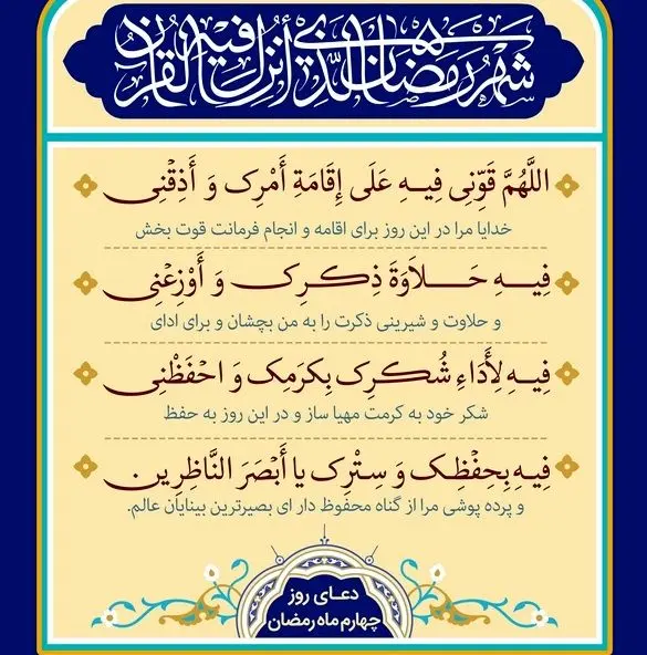 متن و ترجمه دعای روز چهارم ماه مبارک رمضان همراه با عکس، صوت و فیلم این دعا تقدیم می شود.