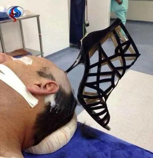 روز گذشته مرد عربستانی با حالتی عجیب طوری که پاشنه تیز یک کفش زنانه در سرش بود به بخش اورژانس بیمارستانی در شهر الجبیل عربستان منتقل شد.این خبر با واکنش های بسیاری از کاربران روبرو شد.