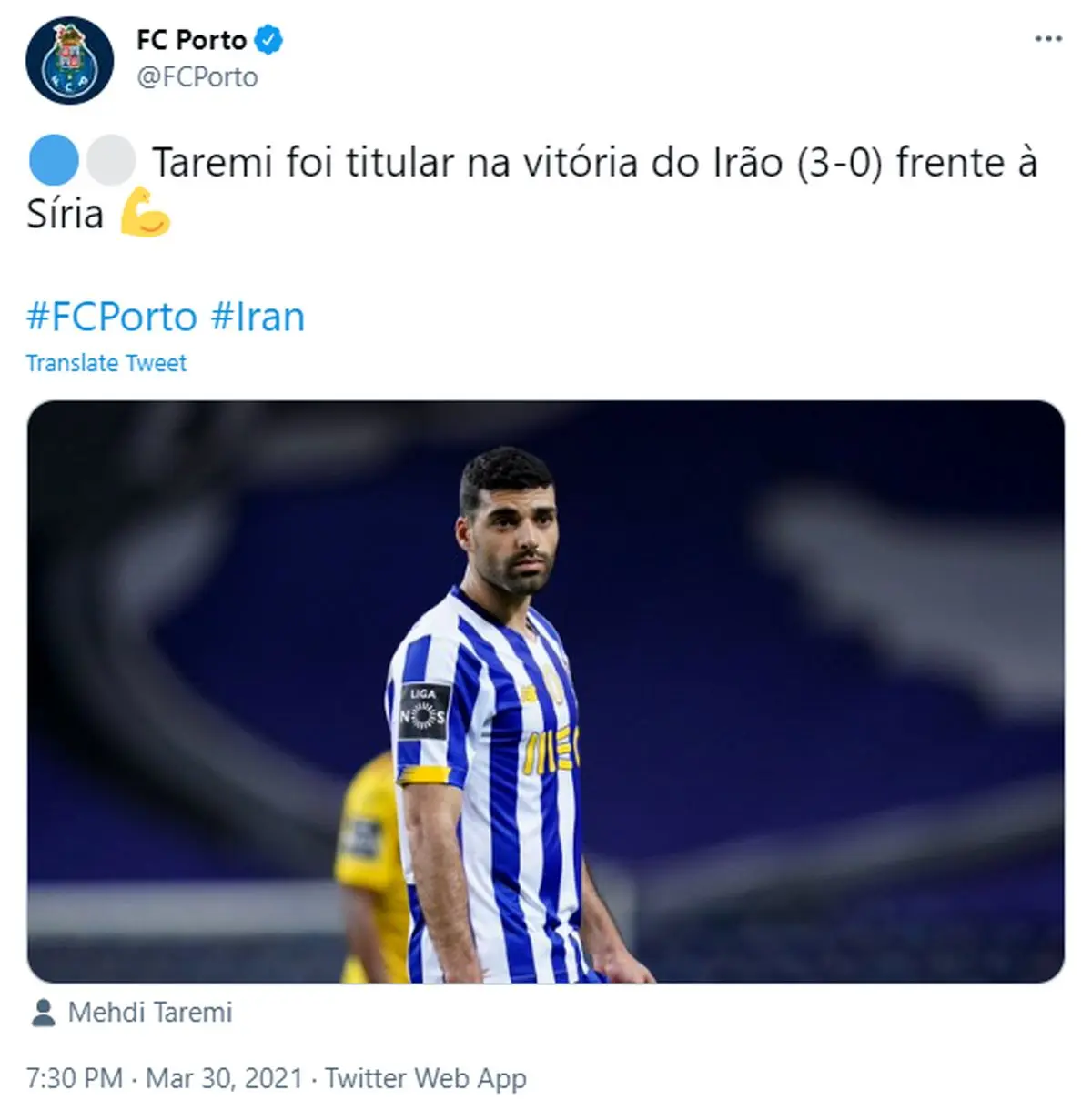 باشگاه پورتو در پستی از عملکرد طارمی در دیدار مقابل سوریه صحبت کرد و نوشت مهدی در ترکیب اصلی ایران در پیروزی 3 بر صفر قرار گرفت.