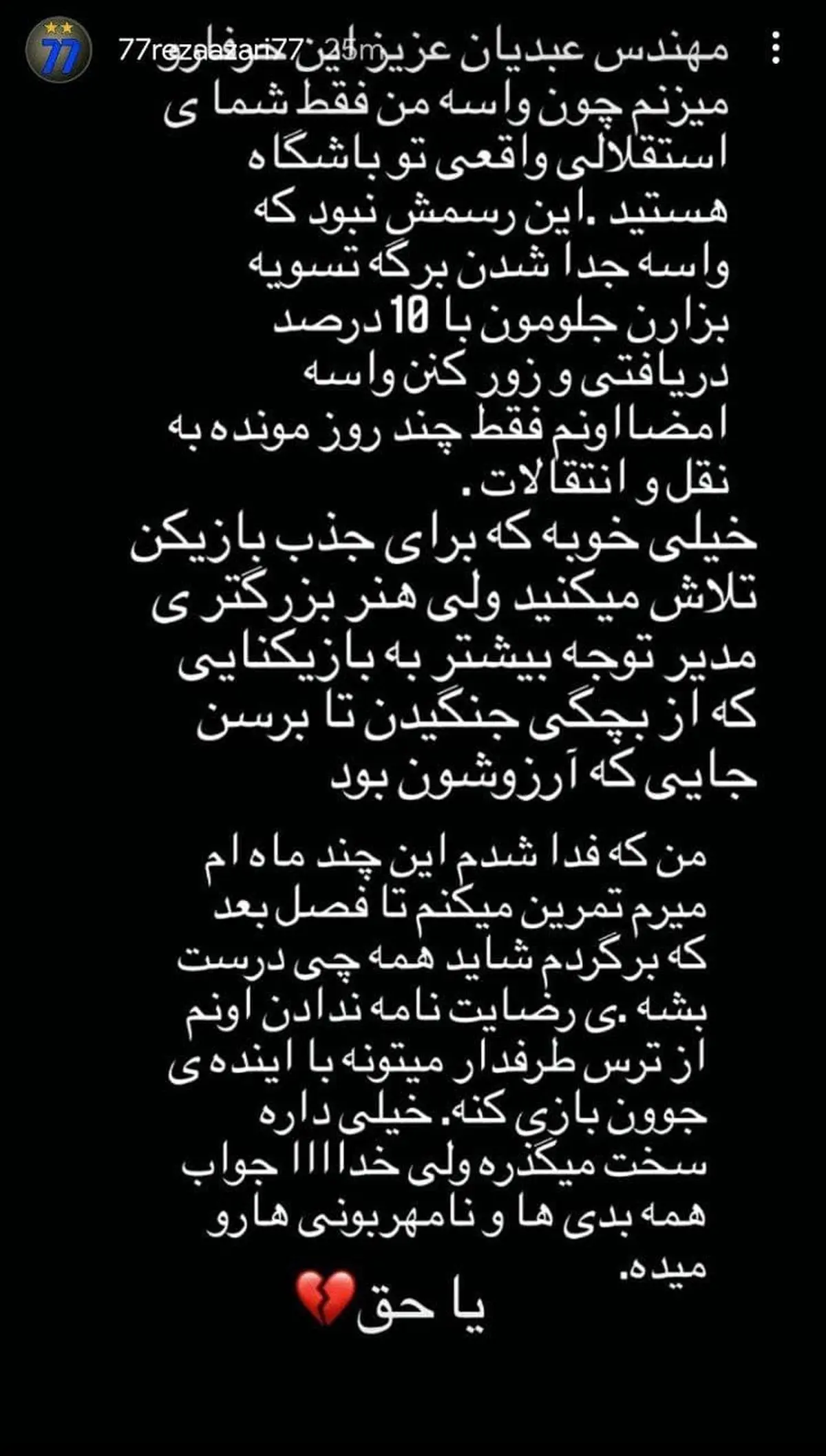 رضا آذری با انتشار یک استوری در صفحه شخص اینستاگرامی اش، از رفتار مدیران استقلال در رابطه با جدایی اش، انتقاد کرد.