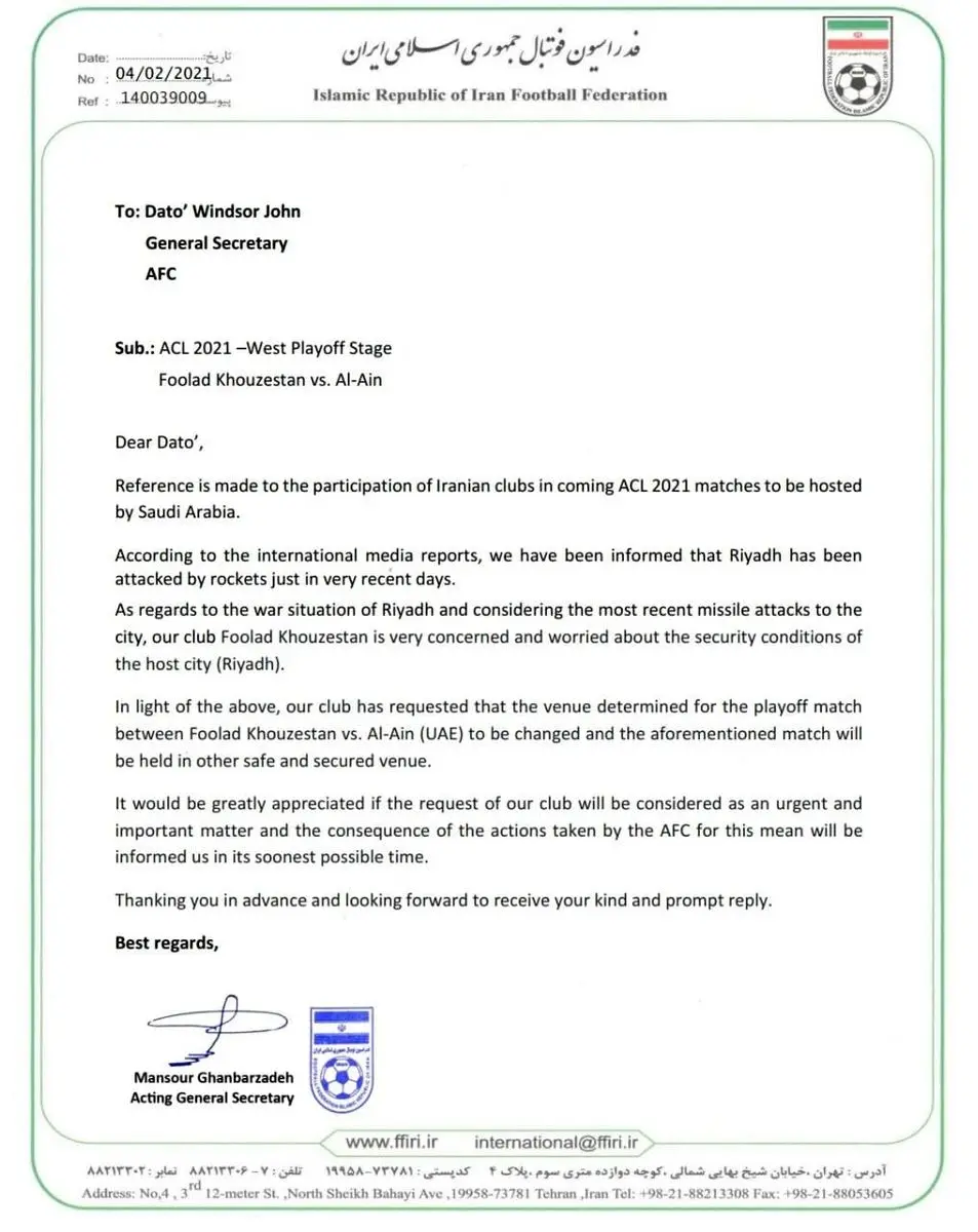 فدراسیون فوتبال با ارسال نامه ای به کنفدراسیون فوتبال آسیا خواستار تغییر محل بازی فولاد خوزستان و العین امارات شد.